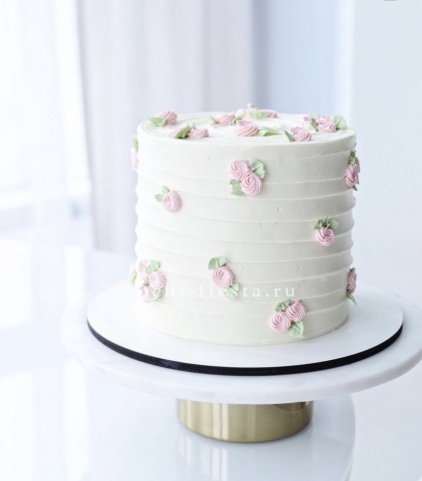 Белоснежное покрытие с объёмными бутонами напоминает зимний сад. Каждая деталь прорисована вручную, создавая впечатление живых цветов на воздушной поверхности. Двухъярусная композиция выглядит самодостаточно и празднично.